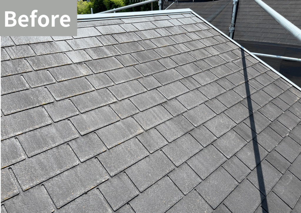 高圧洗浄をした後の写真です。 屋根塗装に入る前に、苔や汚れ、古くなった塗膜をしっかり落として、きれいな状態に整えました。