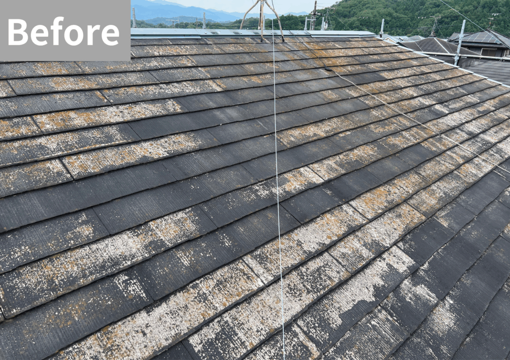 長年の経年劣化により、塗膜の剥がれや苔・汚れの付着が見られます。