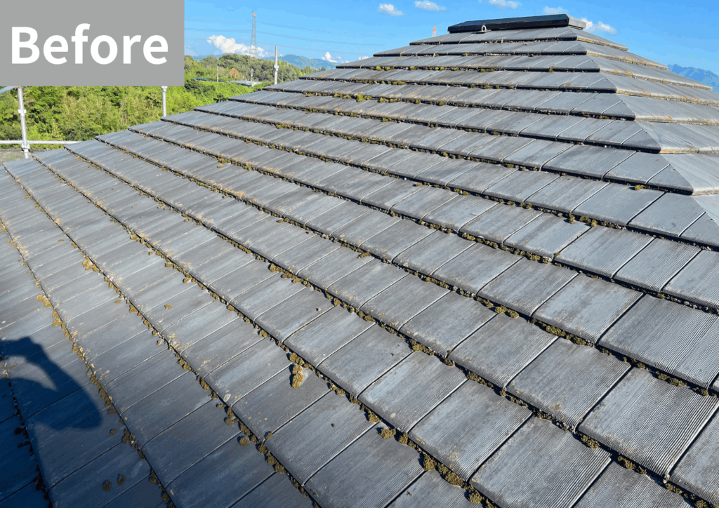 何も手を加えていない状態のため、苔や汚れ、色あせが目立っているのが分かります。