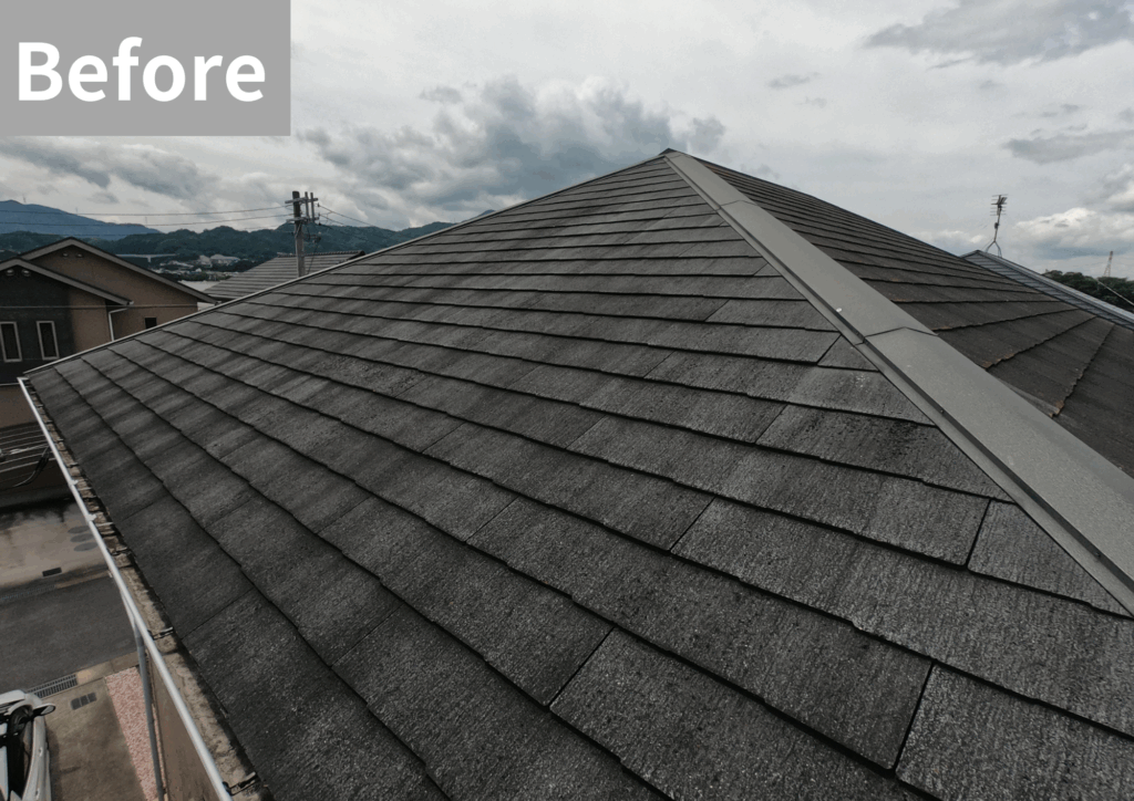 長年の風雨や紫外線の影響で、屋根の色あせや汚れ、細かな劣化が見てとれますね。