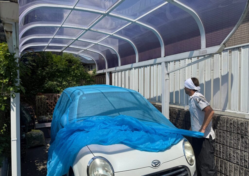 万が一、塗料や汚れが飛散して大切なお車に付着してしまわないよう、しっかりとカバーをかけて養生を行っています。