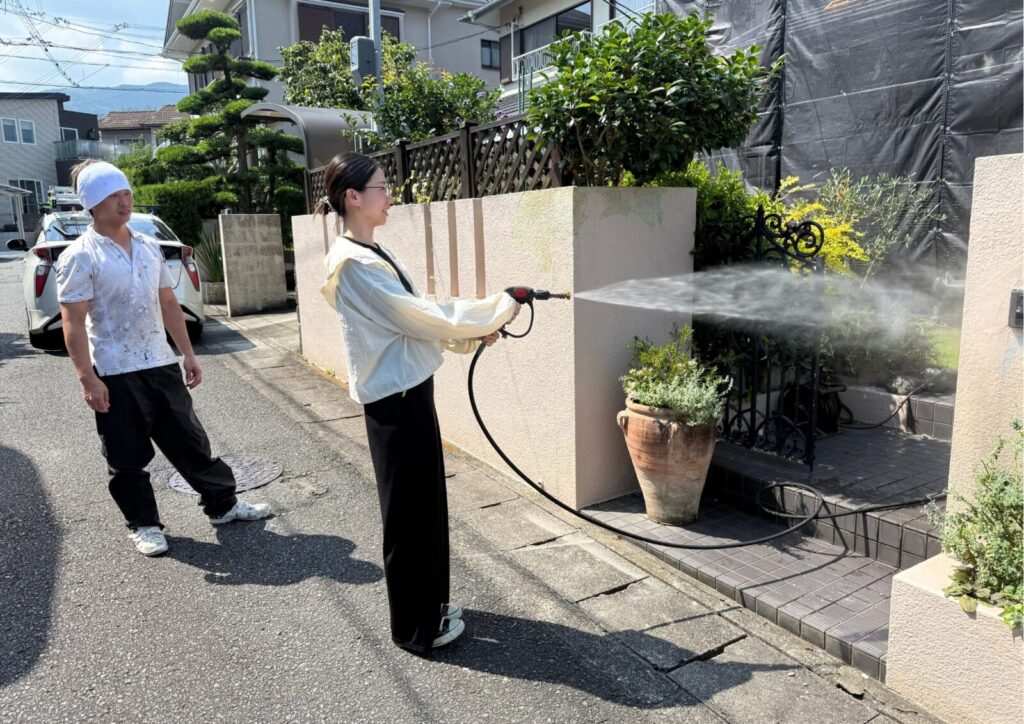 圧が強すぎると外壁を削ってしまうこともあるため、状態を見ながら加減しつつ、落とせる汚れを丁寧に洗い流していきます。