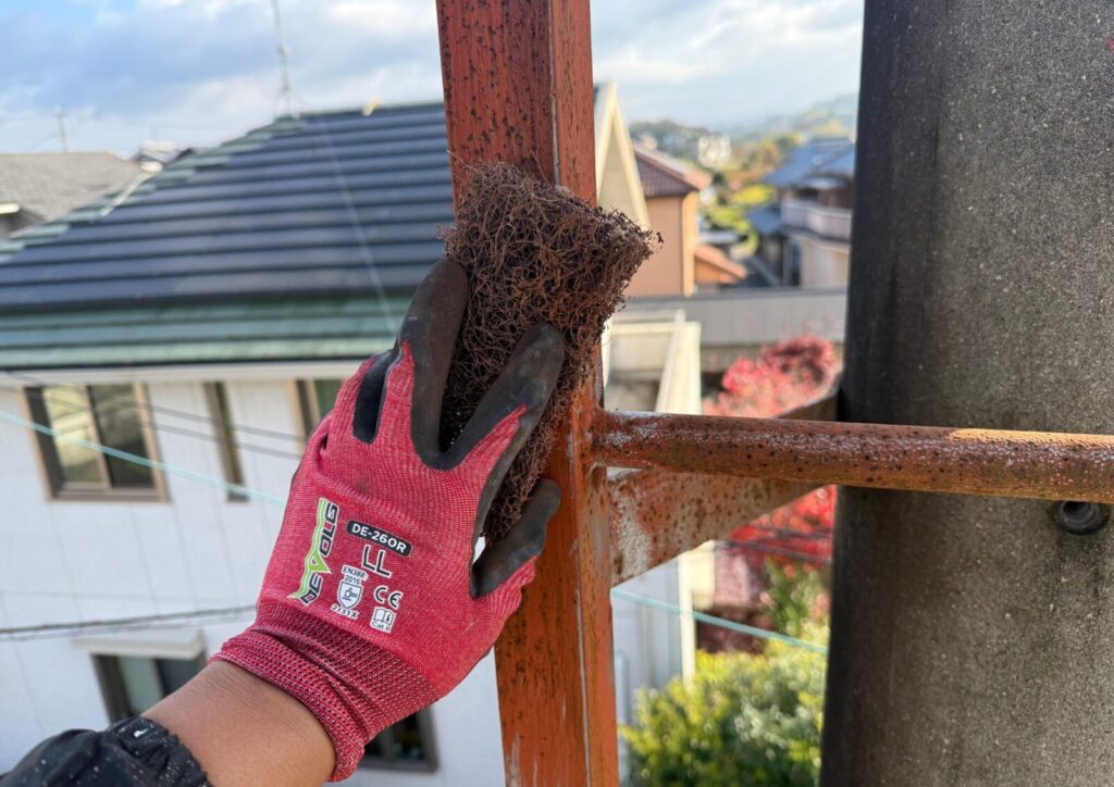 このまま塗装してしまうと再発の原因になるため、まずは手作業でサビを一つひとつ丁寧に落としていきます。